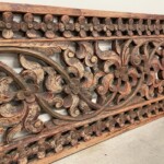 - DESCRIPTION: This intricately hand carved architectural panel has a beautiful design and organically weathered patina. It was originally part of a set of Old Indonesian Doors, located at the entrance of a traditional house in Madura, Indonesia. This old teak panel has a myriad of floral rosettes and so much gorgeous detail, showcasing the expert skills of traditional Indonesian woodcarvers. This teak architectural panel was completely painted at one time but much of the original color has faded due to the hand of mother nature. It’s design provides versatility for display, since it can be hung horizontally or vertically. Hand crafted by village artisans in Indonesia from Teak wood / original aged patina.