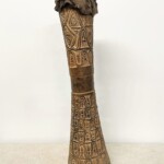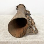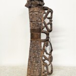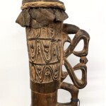- DESCRIPTION: If you love tribal art or into indigenous drums, this a wonderful piece to add to your collection. This handsome drum is an original, vintage piece of the Asmat people in Papua, Indonesia. Hand crafted from one solid piece of wood, carved geometric detail decorates the entire body of the drum. A uniquely crafted handle, replete with carved out human and animal figures make this Asmat drum a standout piece of ethnic artwork. Animal skin is used for the batter head, and a woven rattan ring secures it to the body. This is an absolutely cool piece to add to your home decor.