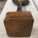 - DESCRIPTION: Once a utilitarian tool, and now an objet d’art of the beloved rice goddess Dewi Sri, this old rice sheaf paddle is sure to catch the eyes of those with discerning taste. Elegantly displayed atop a modern teak stand, this unusual piece will be a unique addition to your home décor. Referred to in Bali as “panatapan,” the paddle had a utilitarian purpose for work in the rice fields. Village farmers would use “panaptapan” to pound the ends of the rice stalks to even them up and make a uniform sheaf. The bundled rice stalks were then stored in the village rice barn. Handcrafted in Bali from a solid piece of teak wood decades ago, the upper portion of the paddle has a beautifully carved face of the deity Dewi Sri, the revered goddess of rice, fertility, and abundance. Hand painted to add decoration and detail, yet it’s current condition displays an antiqued patina from age and use. A carved out opening in it’s handle was for the purpose of hanging and storage when not in use. Antiqued patina throughout consistent with age and wear.