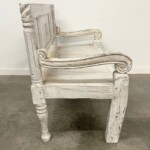 - DESCRIPTION: This antique whitewashed wood bench is a one-of-a kind with country cottage chic style. Indonesian artisans handcrafted and incorporated vintage wood carved panels, posts and turned legs to create this unique solid wood bench full of rustic charm. Handsome carved detail throughout, including the beautiful scrolled arms with carved detail juxtaposed with hefty/ solid rustic legs are part of it’s artistry. An antique white distressed hand finish, with iridescent layering of shades adds depth to the finish and completes the look. This antique whitewashed accent bench will be right at home in so many settings and provide extra seating with style! Handcrafted from reclaimed hardwood. Natural organic rustic character and texture throughout from the reclaimed wood. Pillows not included. *Photos of products shown may vary slightly from their original color due to monitor display settings or photography lighting.*