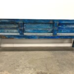 - DESCRIPTION: The beautiful simplicity of this one of a kind reclaimed wood bench is accentuated by a distressed painted finish in a blue turquoise toned hue. Hand crafted with a clean-lined design and functionality in mind, impactful details make this six and a half foot long bench a stand out piece. An antique Indonesian carved teak wood architectural panel handsomely decorates the back, creating an artistic focal point to this long narrow bench. It’s armless design complements the stream-lined styling of the bench and a hand painted and distressed finish give this bench it’s unique patina. Reclaimed teak and other hard wood was used in it’s design to create a sturdy and solidly constructed bench. Whatever your style, this functional painted wood bench will be right at home in a variety of aesthetics. Organic distressed character and texture throughout from the reclaimed hardwood. Hand sanded smooth finish. *Pictures of products shown may vary slightly from their original color due to monitor display settings or photography lighting.* Does NOT disassemble*