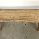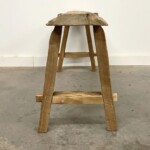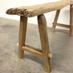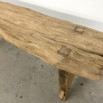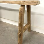 - DESCRIPTION: At three and a half feet long, this rustic teak bench is the perfect home accent piece with all its Old World character and versatility. Handcrafted using a single piece of old teak wood for the seat, and reclaimed teak for the legs, the bench has been hand sanded to reveal the intrinsic character and natural artistry of the old teak wood. It’s A frame styled legs use mortise and tenon joinery for a classic vintage style base. This handsome one-of-a-kind bench can serve as a unique coffee table or low console and easily transition to a variety of settings. Organic rustic character and texture throughout from the old teak wood. Raw smooth, unfinished.