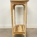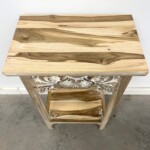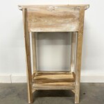 - DESCRIPTION: This petite accent table is a one-of-a-kind piece and slim enough to fit into even the narrowest of spots. An old carved panel decorates the front and a whitewash finish gives it a modern contemporary style. Hand crafted from reclaimed teak and other wood, the beauty of the natural wood grains is still visible with the whitewashed finish. Despite it’s narrow design, a lower shelf provides additional space for displaying a favorite piece. Perfect for a small entry or landing area, as a bed side table or at the end of a hall. Organic texture and character throughout from the reclaimed hardwood. Hand sanded for a smooth finish.