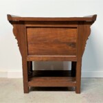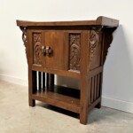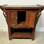 - DESCRIPTION: This unique hand carved console table is the perfect piece to add some Global style to your home décor. Handcrafted in Indonesia by local artisans from reclaimed teak and other hardwood, it has beautiful hand carved detail decorating the front and a traditional door closure. Interior storage and a lower shelf make it functional too! This Indonesian table is a stylish accent piece that would look fabulous in a small foyer, as a bed side table or even as a console for a small TV. Handsome character and texture throughout from the reclaimed wood. *Pictures of products shown may vary slightly from their original color due to monitor display settings or photography lighting.*