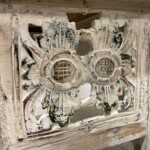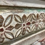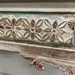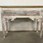 - DESCRIPTION: Hand crafted with a contemporary distressed whitewash finish, this carved console table has wonderful decorative details. It’s size and style will allow it to be right at home in a variety of aesthetics and will add a unique touch to any space. A vintage carved panel graces the front of the whitewashed console and carved floral panels on each side add more details. The reclaimed wood top, with it’s handsome wood grain contrasts nicely to the whitewashed distressed base for a modern style. Handcrafted from reclaimed teak wood and other hardwoods with a distressed whitewashed hand finish. This carved console table is so versatile it’s sure to be a great addition to your home. Works handsomely in the entry way, perfect as a sofa table or a unique Media console. Organic character and texture throughout.