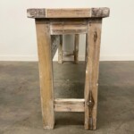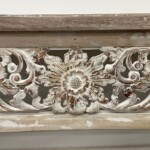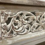 - DESCRIPTION: We love the rustic beauty of this hand crafted carved console table. The floral scrolled intricate panel, hand carved in refined detail, gives this piece an exotic and bohemian flair, yet would be right at home in a traditional setting as well. Hand made from reclaimed hard wood, this carved console table has a whitewashed finish, giving it a contemporary, modern style. The natural beauty and grain of the tropical wood maintains it’s character throughout. It’s an absolutely eye catching piece – perfect in a foyer, as a sofa table or media console – use your creativity! Organic character and texture throughout from the reclaimed wood. Hand sanded – smooth finish.