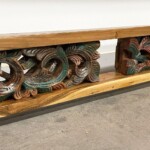 - DESCRIPTION: Another special find from Gado Gado, this handcrafted reclaimed wood console table has a unique design, contemporary style and hard to find dimensions. Over six and a half feet wide, with a narrow depth and slim styling, this reclaimed wood console will work beautifully as a sofa table or gracing a long hallway. Old carved panels from Indonesia were the inspiration for this piece and incorporated into it’s design to create a one-of-a-kind artisan console table. It’s streamlined, contemporary style, with one solid plank of old teak wood for the table top, is a perfect backdrop for the old carved panels that decorate the base and sides. These old panels, with their lovely detail and patina bring an understated Indonesian character and rustic elegance to this handsome console table. Hand crafted by an Indonesian artisan from reclaimed teak and other hard wood, this modern Indonesian console table has gorgeous wood grain and a handsome organic patina.