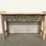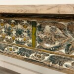 - DESCRIPTION: A handsome vintage carved panel from Indonesia graces the front of this reclaimed wood console table. Hand made using recycled teak wood and other hard wood, this console table has a modern Asian style with it’s natural wood finish. It’s a beautiful console table with an understated, yet eye catching vibe. Organic character and texture throughout. Hand finished, wood and paint lightly sealed with all natural pure shellac. * Photos of products shown may vary slightly from their original color due to monitor display settings or photography lighting.*