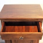- DESCRIPTION: This is a sweet side cabinet with lots of function and and clean lined style. The curved legs are a traditional Asian design and give this teak cabinet unique appeal. The inset detail on the front door and both sides of this cabinet showcases the fine quality of Indonesian craftsmanship. The solid brass floral hardware embellishing the drawer and door adds a simple beauty to this piece as well. Handcrafted from reclaimed teak wood by traditional artisans in Indonesia. Natural organic character from the reclaimed teak.