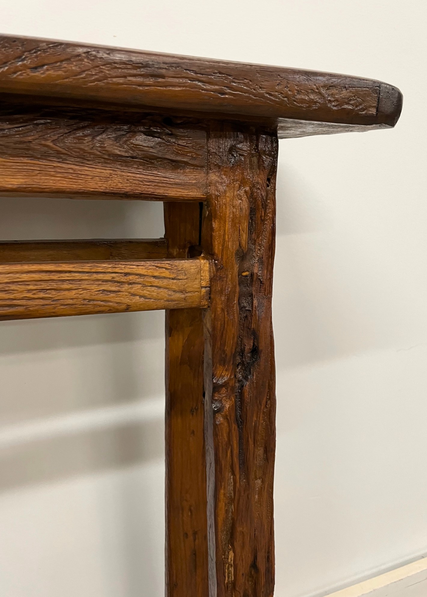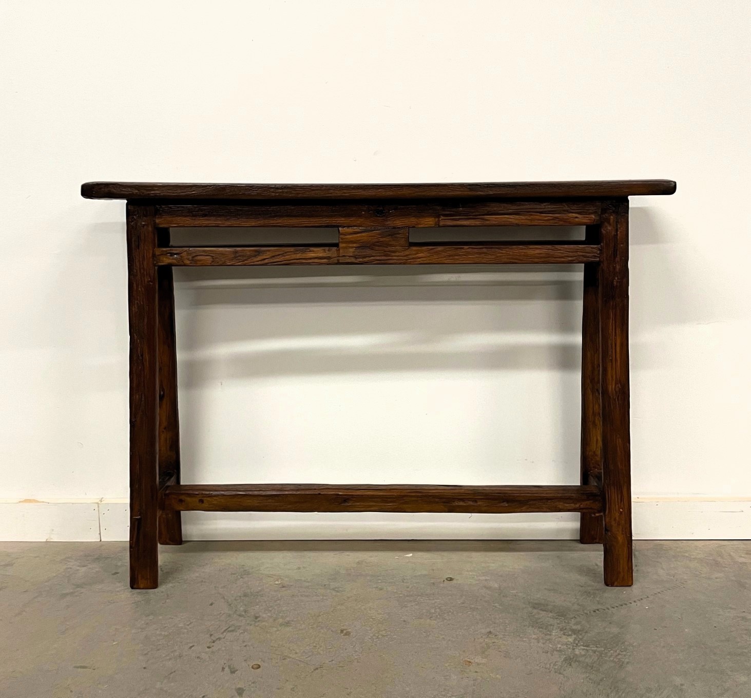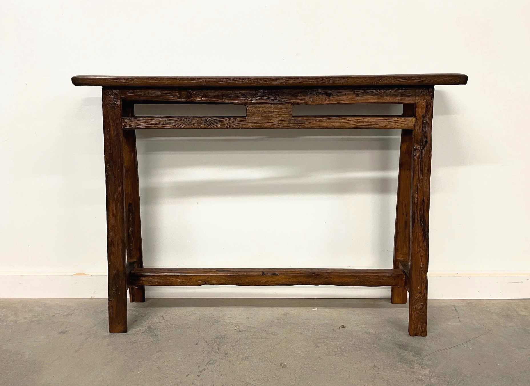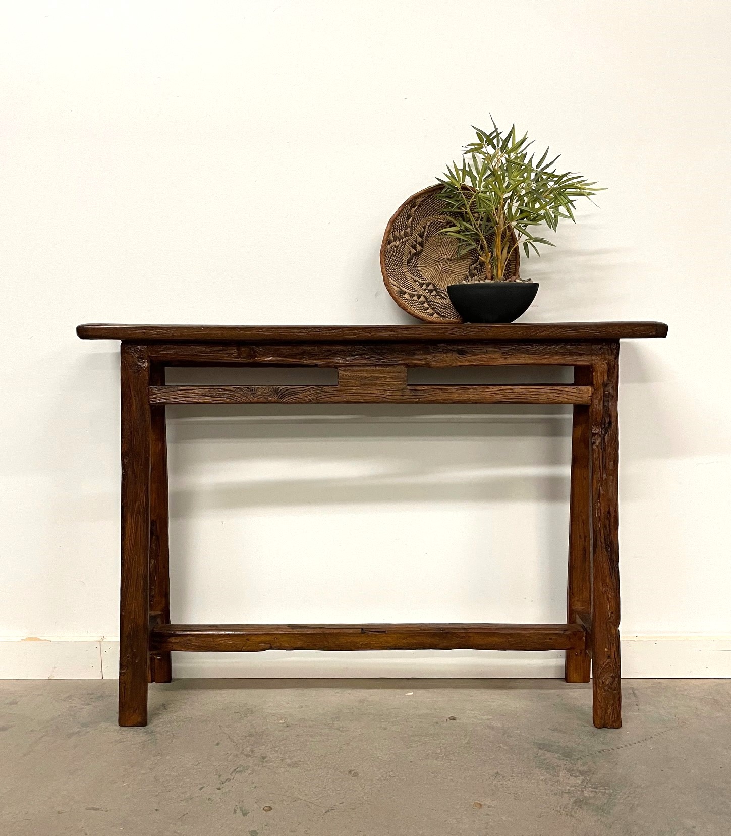 - DESCRIPTION: This rustic console table has an organic simplicity and handsome, natural character from authentic old reclaimed teak wood. Hand crafted from reclaimed teak this entryway console table has that old world vibe, that’ll be right at home in so many spaces. It’s simple lines allow the natural rustic beauty of the teak wood grain to take center stage. A perfect piece for an entry way, under art work or at the end of a hall, this reclaimed teak console table will be a wonderful addition to your home. Rustic character and patina throughout from the reclaimed teak wood. Smooth sanded and finish with all natural pure shellac.