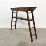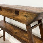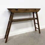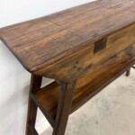 - DESCRIPTION: This rustic wood console table captures the spirit of contemporary design and traditional wood working techniques. It’s simple, timeless style and taller height, make this a wonderful piece for an entry way or under art work, and will transition easily between many home décor aesthetics. Handcrafted from reclaimed teak and other hardwoods, the organic character and variations of the wood enhance it’s overall beauty. Built by hand, with handsome beveled edges, a laddered style flared legged base, and exposed joinery. All distinctive design details that make this a one-of-a-kind piece. Rustic character and patina throughout from the reclaimed hard wood.