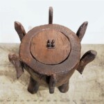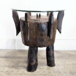 - DESCRIPTION: Add some ethnic decor to your home with a handsome accent piece like this one-of-a-kind tribal inspired side table from Gado Gado. It’s a totally cool piece that is sure to add personality and eclectic style to any space. The unique base is hand crafted incorporating an old traditional mortar and a round glass top with beveled edge sits atop, creating a wonderful mix of modern and ethnic. The base also has a small space for interior storage and a handcrafted cover adds to the unique elements of this tribal accent table. Organic rustic texture and character throughout. 20″ Commercial glass top included.