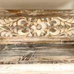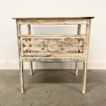 - DESCRIPTION: This one-of-a-kind carved side table is a unique accent piece, combining a whitewashed carved base with an ebony wood top. Handcrafted from reclaimed wood and old carved panels, it’s open shelf design allows for some additional storage with the special feature of a decorative view. An eben wood top was used for the table surface to truly give this piece it’s one-of-a-kind style. Use it as an accent table next to your favorite chair or sofa, as a bedside table or even a great piece for your vintage turntable. With so much versatility it will easily be at home in a variety of settings, Organic rustic texture and character throughout consistent from the reclaimed wood/ Whitewashed and hand sanded for a smooth finish.