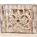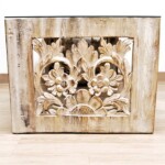 - DESCRIPTION: This intricately hand carved coffee table is a true rustic beauty! With finely carved detail throughout and a whitewash distressed hand finish, this coffee table will be a great addition to any space. The coffee table’s open design has room to tuck some floor pillows underneath and it’s size is perfect even for a small room. Hand crafted in Indonesia by village artisans from reclaimed hard wood. Organic rustic character and texture throughout from the reclaimed hardwood and whitewash finish. Glass included.